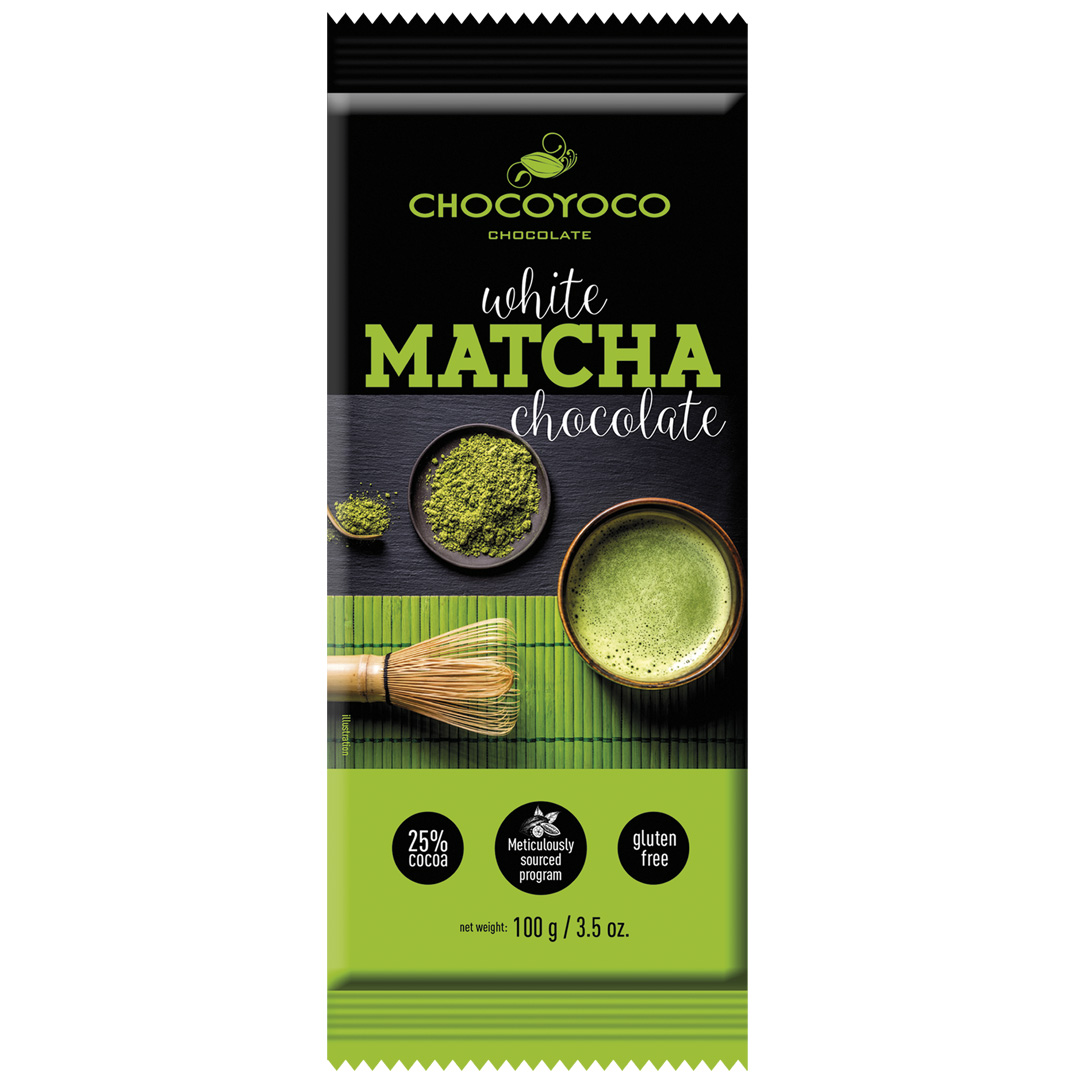 Herkullinen Chocoyoco-valkosuklaa, johon on sekoitettu matcha-vihreää teetä. Tuloksena on ainutlaatuisen pehmeä, aromikas ja raikkaasti vihertävä suklaaelämyys.